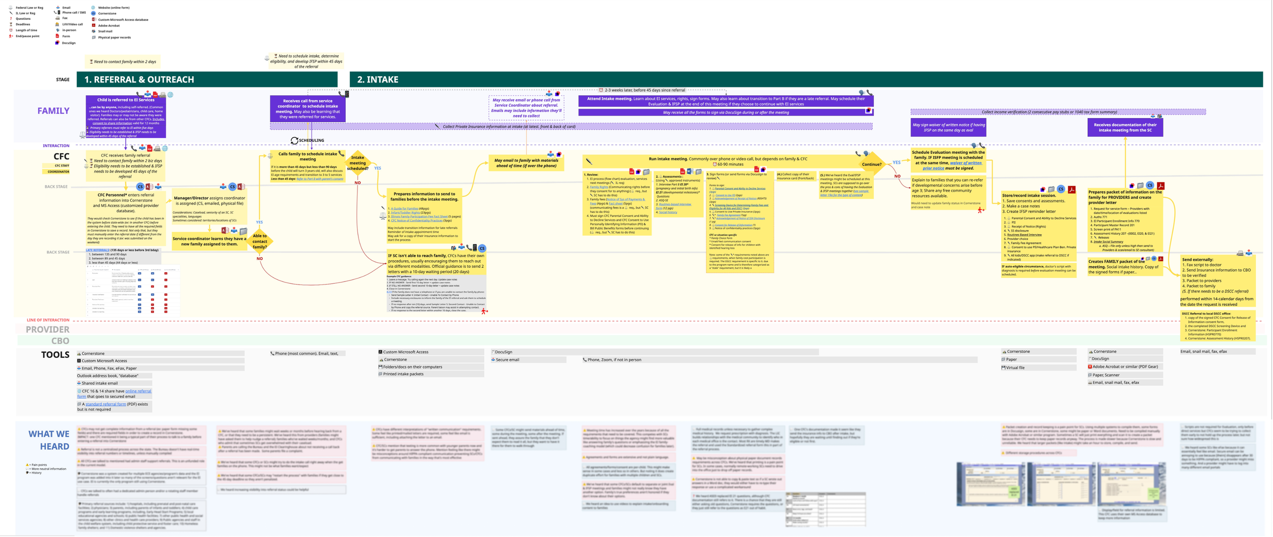 The EI system in IL extends across departmental and agency entities, even with the new centralized IDEC umbrella. Like many places, each of these individual entities works in a task-based silo. With the formation of IDEC, there’s an opportunity to integrate across organizational boundaries more efficiently, oriented around the service interaction experienced by the customer (like a family or provider) rather than separate tasks owned by different government entities. The process maps we developed identified several areas where handoffs could be made more seamless.